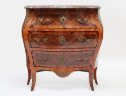 Stockholmsarbete 1700-talets andra hälft, fanerad med bla. jakaranda och plommon, beslag och ornament av mässing, 3 lådor, ursprunglig profilerad svängd skiva i röd kalksten, nätt modell, höjd 89, bredd 85, djup 44 (renoverad, kompletterad, äldre fanérlagningar)