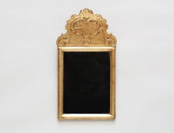 Sverige 1700-talets andra hälft, förgylld, uppsvängt krön med träskuren dekor i form av rocailler och akantus, högklassig rokoko, 45x24 (senare spegelglas och förgyllning)