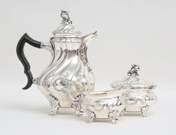 CG Hallberg Stockholm 1950/51, silver, dekor av knäckåsar och rocailler, tassfötter, sockerskål och gräddkanna med invändig förgyllning, vikt 1344 inklusive trähandtag, höjd 26