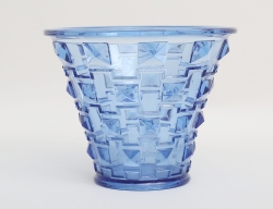 skål blåtonat pressglas, nedåt avsmalnande reliefdekor av fasetter, signerad i relief Orrefors GP14, höjd 16, diameter 19,5 (smärre beläggning nedtill invändigt)