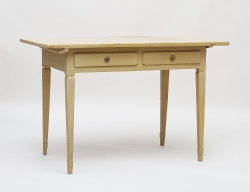 kvadratiska nedåt avsmalnande ben med kannelyrer, fristående, sargen med två lådor, bemålat, nyckelbeslag i mässing, höjd 78, bredd 119, djup 65 (bemålning med fläckar och avskav, lås saknas)