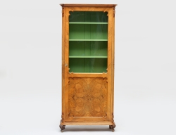 valnöt/valnötsrot, träskuren dekor, profilerade lister, sex hyllplan, invändig bemålning i lindblomsgrönt, höjd 182, bredd 82, djup 28