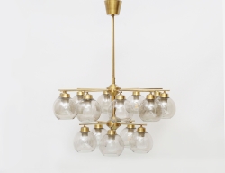 takarmatur 1960/70-tal, Westal Bankeryd, stomme i mässing, 15 ljusarmar med kupor i röktonat glas, höjd 95, diameter ca. 75 (en kupa med skada)