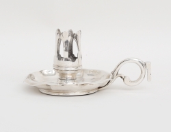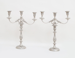 England 1800-tal, nysilver, ornamenterad dekor, för vardera 3 ljus, tvådelade och konvertibla till ljusstakar, fyllda bottnar, höjd 49, bredd 39 (2 ljushattar saknar skaft)