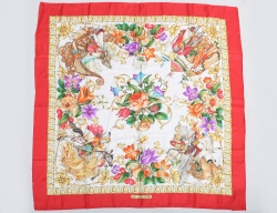 scarf "Le Legende", siden, blomstermotiv, röd bård, tags kvar, gott skick, 88x88