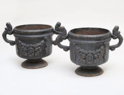 tidigt 1900-tal, bemålat gjutjärn, troligen Stavjsö Bruk, liv med festonger och granatäpplen, hänklar i form av sjöjungfruliknande kvinnofigurer, dräneringshål, höjd 38, diameter 33 (rostanlupna)