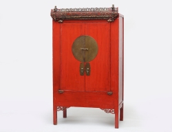 röd lack, genombrutet skuret och förgyllt överstycke, beslag i mässing, ett hyllplan med 2 lådor, öppningsbar botten med förvaringsutrymme, höjd 185, bredd 104, djup 60 (smärre ytslitage, dekordel saknas)