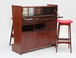 cocktailbar med 1 par barpallar, modell SK661 för J. Skaaning & Co 1960-tal, fronten med utfällbar skiva, inredning för flaskor och glas, nedtill utdragbar låda för flaskor samt mellanliggande låda, fotstöd i mässing, höjd 112, bredd 115, djup 40, citesintyg medföljer