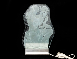 vägglampa Swedish Modern 1940-tal, gjutet glas med graverad och etsad dekor, motiv av kvinna med duva, väggfäste i rostfritt stål med en ljuspunkt, signerad Glössner/Torhamn, 41x25
