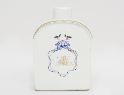 kompaniporslin sent 1700-tal/c.1800, polykrom dekor, delvis förgylld, monogram i rosettring, krönande fågelpar, höjd 13, bredd 8,5