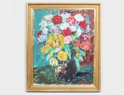 oljemålning på duk, blomsterstilleben, inköpt direkt av konstären i dennes ateljé Göteborg sedan i arv till nuvarande ägare, signerad, 93x73, rammått 108x90