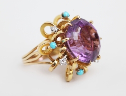 större fasettslipad ametist (16,5 mm.), samt turkoser och briljantslipade diamanter (4st), totalt ca. 0,12 ct., vikt 18,19 gram, storlek 17,5-18/55-56