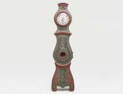 Västergötland/Västra Såland, 1700-talets andra hälft, träskuren dekor med polykrom bemålning, urtavlan märkt Sandström, urverk i mässing med dubbla klangskålar, auktionens golvur finns avbildat och omskrivet (sid 168) som med förfalskad signatur på urtavlan i boken "Allmogeurmakeriet i Västergötland och i västra Småland" av Einar Magnusson, höjd 215, bredd 48 (smärre torksprickor, visarna något lösa)