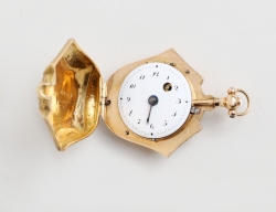 empir tidigt 1800-tal, savonett, sköldformad, rikt graverad dekor av bla. två olika troliga släktvapen sannolikt släkten Grills, invändigt litet spindelur, balansen fungerar, bruttovikt 15,14 gram, 4,2x3