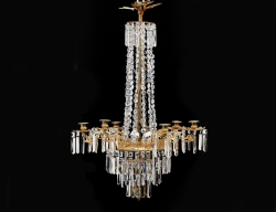 stomme i förgylld genombruten mässing, stavformade och övriga fasettslipade prismor, 6 ljusarmar, höjd 100, diameter 65