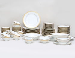 Noritake China Japan 1900-talets andra hälft, förgylld dekor, hela dussin av mattallrikar, djupa tallrikar, dessert, assietter, små djupa samt kaffekoppar med fat, såsskål, 4 uppläggningsfat, sockerskål samt gräddsnipa (sockerskål saknar lock) (79)