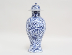Holland 1700-tal, fajans, handmålad blåvit dekor, signerad fam. Clou (?), höjd 32, lock samt fotring med obetydligt glasyrslitage, lagad knopp)