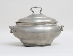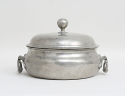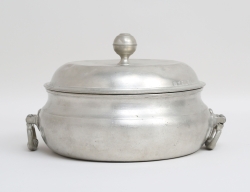 Marieberg 1765, fajans, dekor av fjäderskrud, signerad MBE under tre kronor 31/6-65, Ehrenreichs period (1758-1766), målarsignatur ES, höjd 7, bredd 15x10 (lock saknas, glasyravslag)