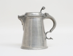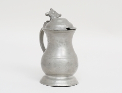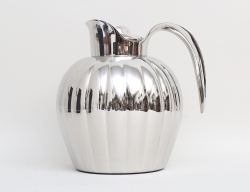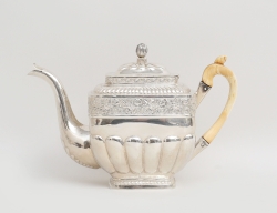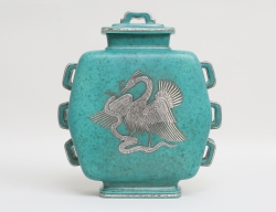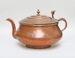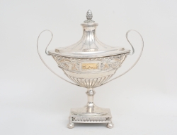 silver, Pehr Zethelius Stockholm 1796, gallerfot på kulfötter, liv med reliefdekor delvis förgylld, motiv av figur och hus, uppsvängda hänklar, lockknopp i form av pinjekotte, vikt 592 gram, höjd 24, bredd 21