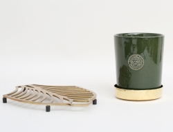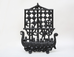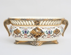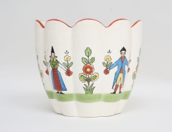 tidigt 1900-tal, bemålat gjutjärn, troligen Stavjsö Bruk, liv med festonger och granatäpplen, hänklar i form av sjöjungfruliknande kvinnofigurer, dräneringshål, höjd 38, diameter 33 (rostanlupna)