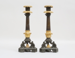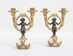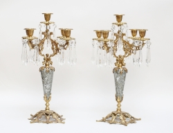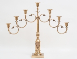 1800-talets senare del, förgylld brons, rik reliefdekor delvis polerad, krönande örn, för vardera sex ljus, höjd 59 (smärre fläckar, färgskiftningar)