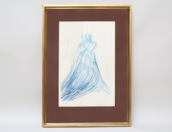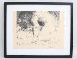 litografi 30/30, Jacqueline en Espagna ur mappen "La Flute double", vattenstämpel Au Vent D´ Arles, historik: inköpt av säljarens far på galleri i Paris på 1970-talet därefter i arv till nuvarande ägare, märkt Dimanche octubre -55 i vänster hörn samt stämpelsignerad Picasso, bladstorlek 53x42, rammått 72x62