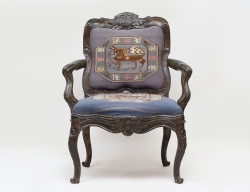 Nordeuropa 1700-talets mitt, heltäckande rikt träskuren dekor av rocailler, bladslingor och akantus, bemålad, fast stoppad rygg och löst stoppad sits, slottskvalité med sittbredd 70 cm, höjd 108, bredd 83 (åldersrelaterat slitage, smärre avslag på klacken höger framben)