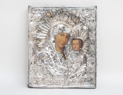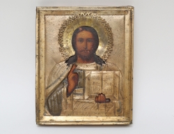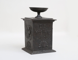 Italien 1857, kvadratisk fotplatta på kulfötter, reliefdekor av bla. akantus och blommor, vikt ca. 870 gram, höjd 26, bredd 14