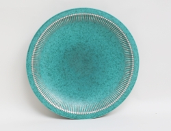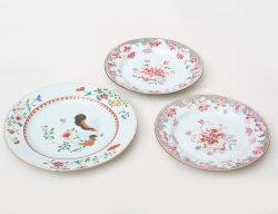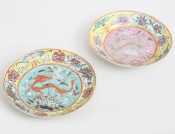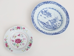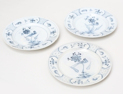 varav 2 daterade 1757, Rörstrand fajans, spegel med dekor i starkeldsblått av fågel på kvist, kant med dekor av humle, diameter 22,5 (en lagad, nagg, sprickor, retuscher)