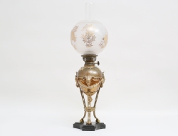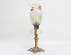 genombruten fot i bronserat gjutgods, fotplatta och stam i alabaster, oljehus i glas med slipad dekor, ursprunglig glaskupa med målad polykrom växtdekor, höjd 57