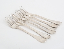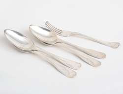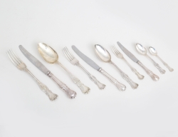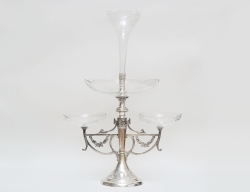 England 1800-tal, nysilver, ornamenterad dekor, för vardera 3 ljus, tvådelade och konvertibla till ljusstakar, fyllda bottnar, höjd 49, bredd 39 (2 ljushattar saknar skaft)