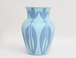 vas jugend, överfång med grön växtdekor mot frostad fond, signerad, höjd 18, historik: Inköpt i antikaffären Gula Huset Löderup omkring 2010 sedan i arv till nuvarande ägare, (mynningen möjligen nedslipad (?))