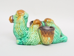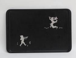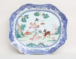 Qianlong 1736-1795, rokoko, blåvit underglasyrdekor, spegel med polykrom emaljdekor i famille rose i form av kvinna och hjort, 45,5x39,5 (brätte med spricka och smärre nagg)