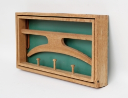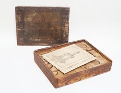 skjutlåda i trä med byggsatsdelar i olika former, 2 modellbilder medföljer, ej genomgånget, 34x27