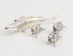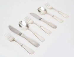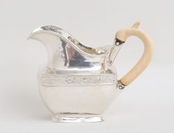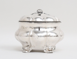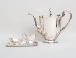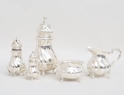 CG Hallberg Stockholm 1950/51, silver, dekor av knäckåsar och rocailler, tassfötter, sockerskål och gräddkanna med invändig förgyllning, vikt 1344 inklusive trähandtag, höjd 26