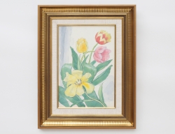 oljemålning på duk, blomsterstilleben, inköpt direkt av konstären i dennes ateljé Göteborg sedan i arv till nuvarande ägare, signerad, 93x73, rammått 108x90