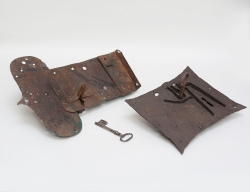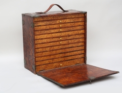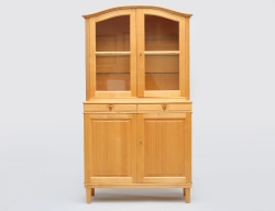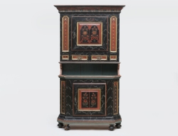 troligen Sydsverige, bonad ek med bandintarsia, överskåpet med ett hyllplan samt skedhylla, två mindre lådor, underdel med fyra lådor, beslag i gjuten mässing, demonterbart i 5 delar, höjd 200, bredd 134, djup 52 (underdelan saknar nyckel)