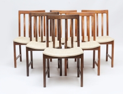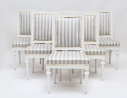 Stockholmsarbeten sent 1700-tal, träskuren dekor av bandfläta och fleuroner, runda överkragade ben med kannelyr, bemålade, fast stoppad sits och rygg, en stol med etikett - Stockholms Hallstämpel, höjd 92, bredd 50 (sliten och fläckad klädsel)