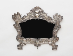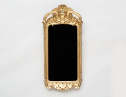 Sverige 1700-talets andra hälft, förgylld, uppsvängt krön med träskuren dekor i form av rocailler och akantus, högklassig rokoko, 45x24 (senare spegelglas och förgyllning)