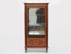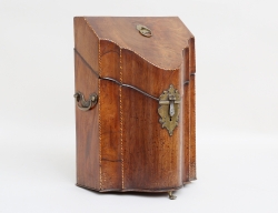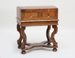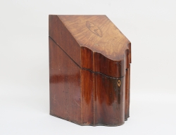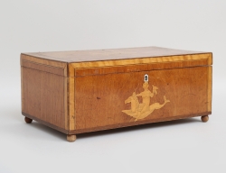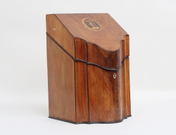 c.1800, mahognyfanér, lock med intarsia i form av vinbärssnäcka, höjd 38,5, bredd 22, djup 29,5 (nyckel sknas)