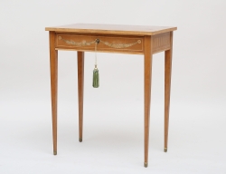 kvadratiska nedåt avsmalnande ben med kannelyrer, fristående, sargen med två lådor, bemålat, nyckelbeslag i mässing, höjd 78, bredd 119, djup 65 (bemålning med fläckar och avskav, lås saknas)