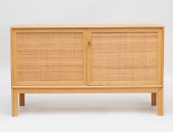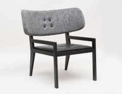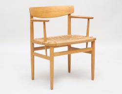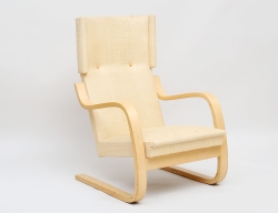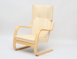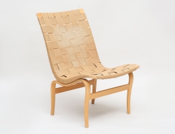 formgiven 1941, tillverkad 1941, signerad BM 1941 på pappersetikett, även stämpelmärkt, stomme av böjträ i bok, klädsel av beige sadelgjord, orört originalskick, höjd 80, bredd 50 (obetydligt bruksslitage)
