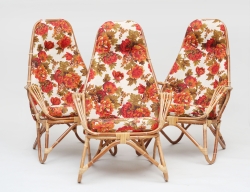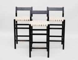3 barstolar "Schablon", svartlackerad stomme i bok, sits i flätad sadelgjord, höjd 87, sitthöjd 66 (färgslitage på samtliga samt fläckar)