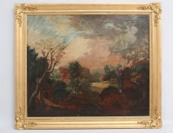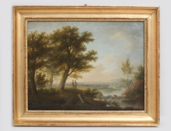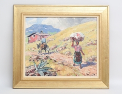 oljemålning uppfodrad på duk, landskap med byggnader och figurer, 74x89, rammått 90x104 (retuscher)