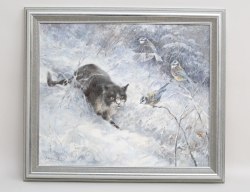 oljemålning på duk, färgglad skata mot grönt, signerad, 47x38, rammått 50x41