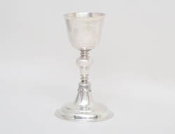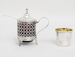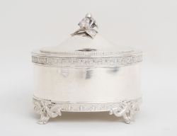 Gustaf Möllenborg Stockholm 1851, genombruten kant med akantus, tassfötter, lockknopp i form av blomma, vikt 521 gram, höjd 24,5 (gåvoinskription runt fotringen)