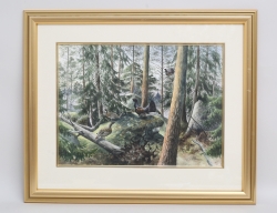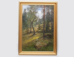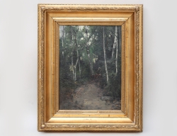 akvarell, solbelyst björkdunge, signerad H af Klint samt även signerad atergo, dagermått 29,5x22, rammått 35x27, historik: säljarens farfar var stadstjänsteman Helsingborg. Han hade ett stort engagemang i stadens kulturliv, där han umgicks i kretsen bland konstnärer och intellektuella, Auktionens målning inköptes sannolikt 1932-1934 då Hilma bodde i Helsingborg, sedan i arv inom familjen, Auktionskammaren tackar fil. dr Johan af Klint för information och katalogisering av detta verk
