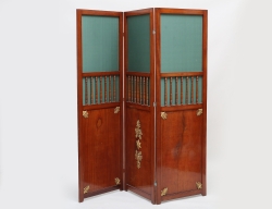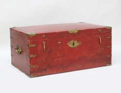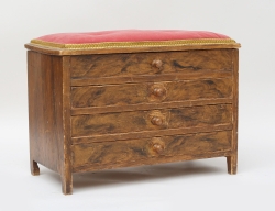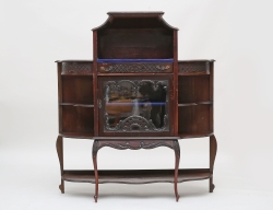 röd lack, genombrutet skuret och förgyllt överstycke, beslag i mässing, ett hyllplan med 2 lådor, öppningsbar botten med förvaringsutrymme, höjd 185, bredd 104, djup 60 (smärre ytslitage, dekordel saknas)