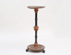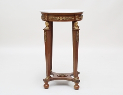 mahogny, raka nedåt avsmalnande ben, mässingsbeslag i form av karyatider, palmetter, fleuroner och rosettgirlanger, skiva i vit marmor, höjd 79, diameter 46