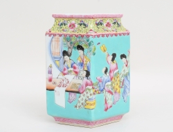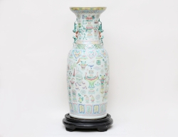 Qianlong 1796-1795, polykrom emlajdekor i famille rose, delvis förgylld, flätade hänklar med fästen i relief, höjd 14, diameter 10 (mynning med spricka och smärre nagg)